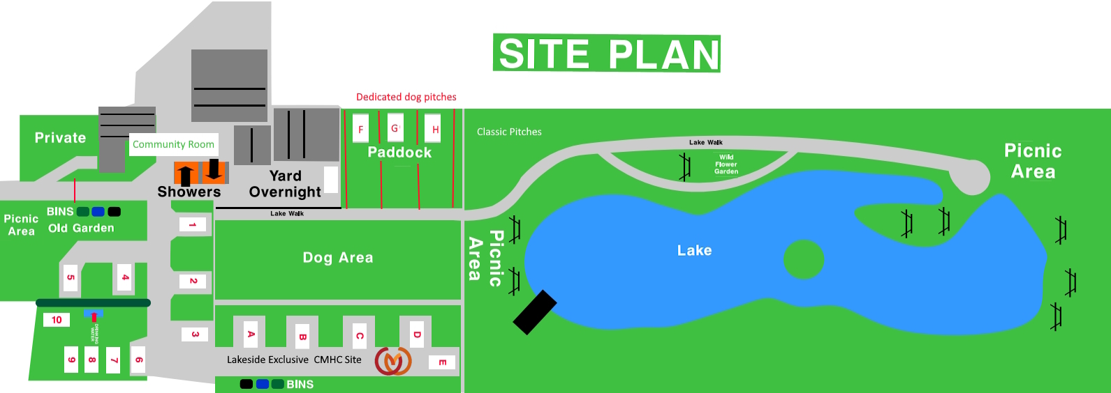 Hard Standing overlooking lake £40/night (2 pitches D & E) inclusive of electric (16A ehu),mains water on pitch, use of central heated shower block and dog exercise area.